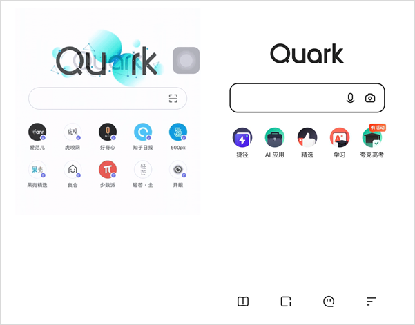 现在的夸克,基本界面还是维持了去年版本的简洁,设计也有所优化,但默认状态下,搜索栏底下的图标显示的分别是:捷径、Ai应用、精选、 学习及夸克高考。
