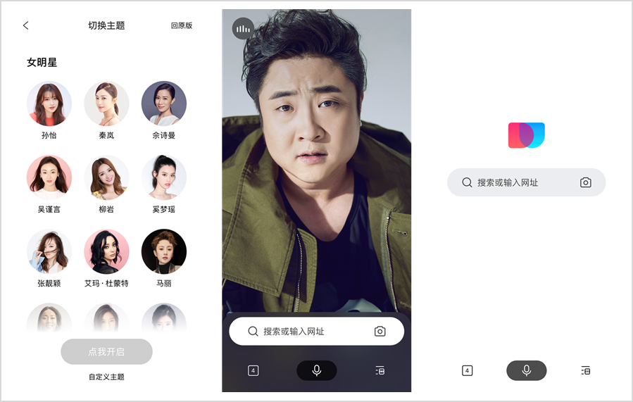 关于主页背景,我们也是可以自定义,可以选择明星主题(当然数量不多),或者是自定义选择图片作为背景,当然还可以回到纯白底+Logo的原版主题。