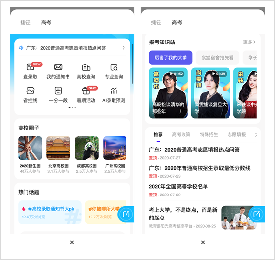 高考专区则是迎合了毕业生的需求,里面会提供录取、查分、高校查询、专业预测等一些列与新晋大学生相关的内容圈子。