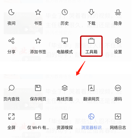 工具箱里面,最最最好用的功能,莫过于资源嗅探了,只要我们在Via浏览器里看视频,利用这一功能可以自动提取背景音乐,像极了QQ音乐识别音乐。