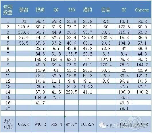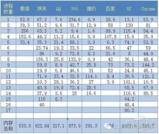 各大浏览器内存占用测试成绩总表(成绩仅供参考,每一台机测试的成绩都不一样)