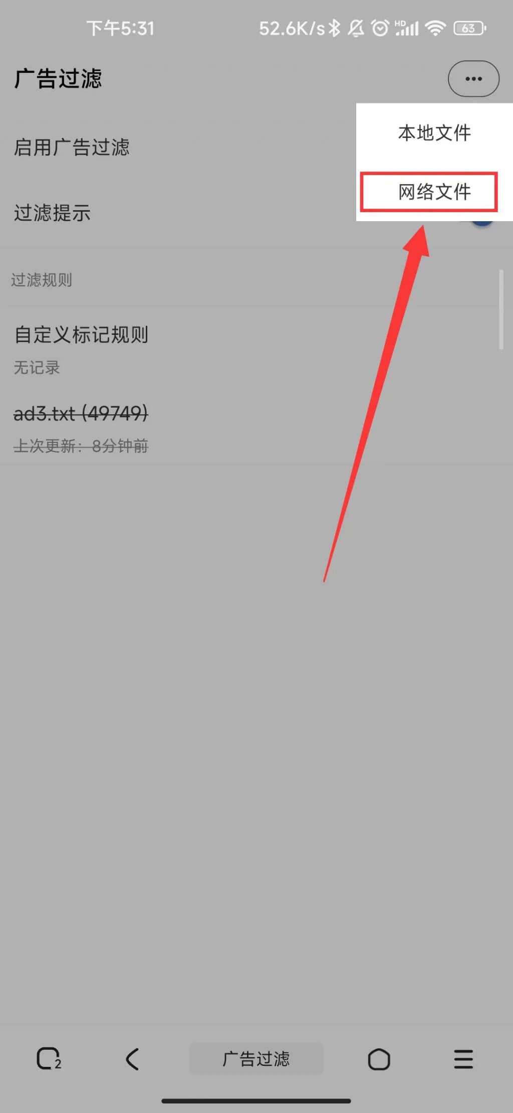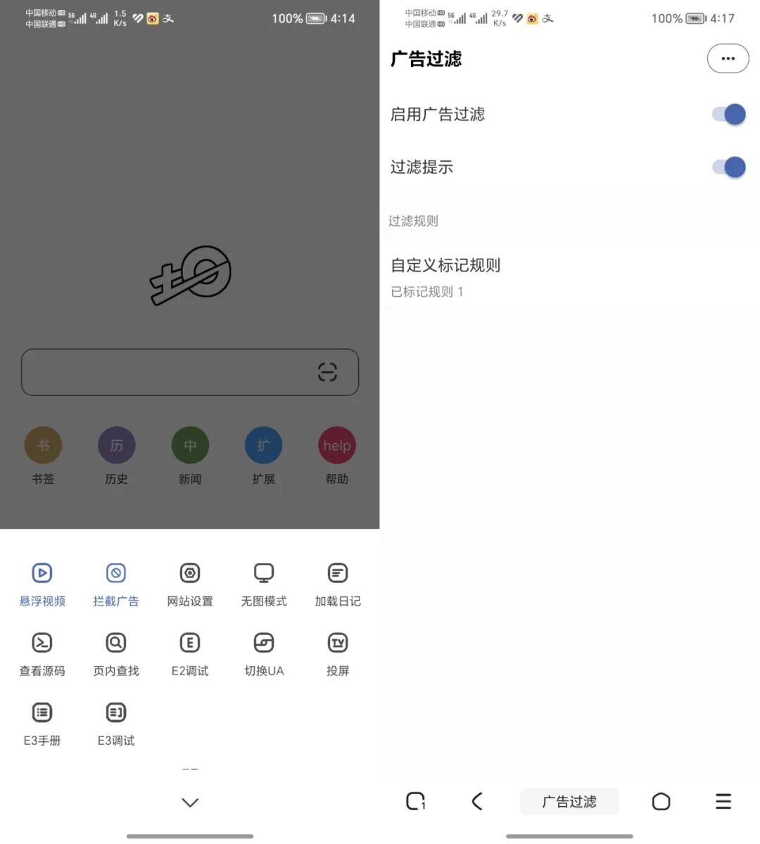 其次,这款浏览器内置了拦截广告的功能,打开拦截广告后,在上面按下拦截广告按钮,就可以到广告过滤设置页面了。