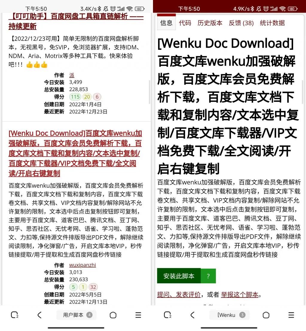 在脚本方面,土狗浏览器直接兼容了油猴和Via浏览器的脚本。如上所述,复制脚本库的链接,并将其粘贴在浏览器中。