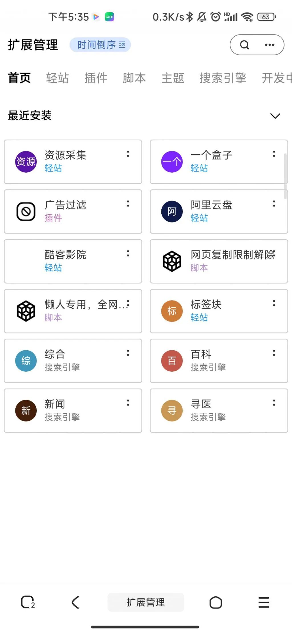 土狗浏览器支持的扩展功能很多,例如轻站、主题、插件、脚本、搜索引擎等等。
