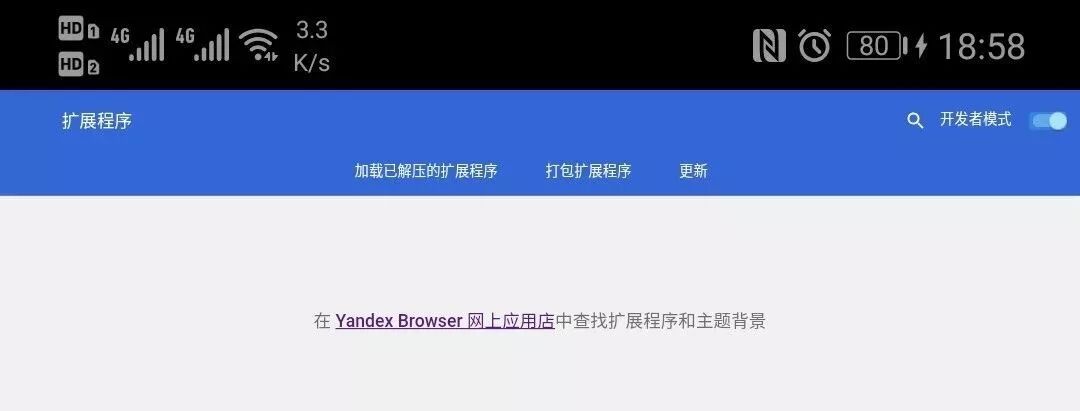 然后在Yandex浏览器地址栏输入Chrome://extensions,进入到Yandex的扩展管理中心。接着,找到页面上方的开发模式,勾选开启。这样,就可以从Yandex手机浏览器安装Chrome插件了。如下图: