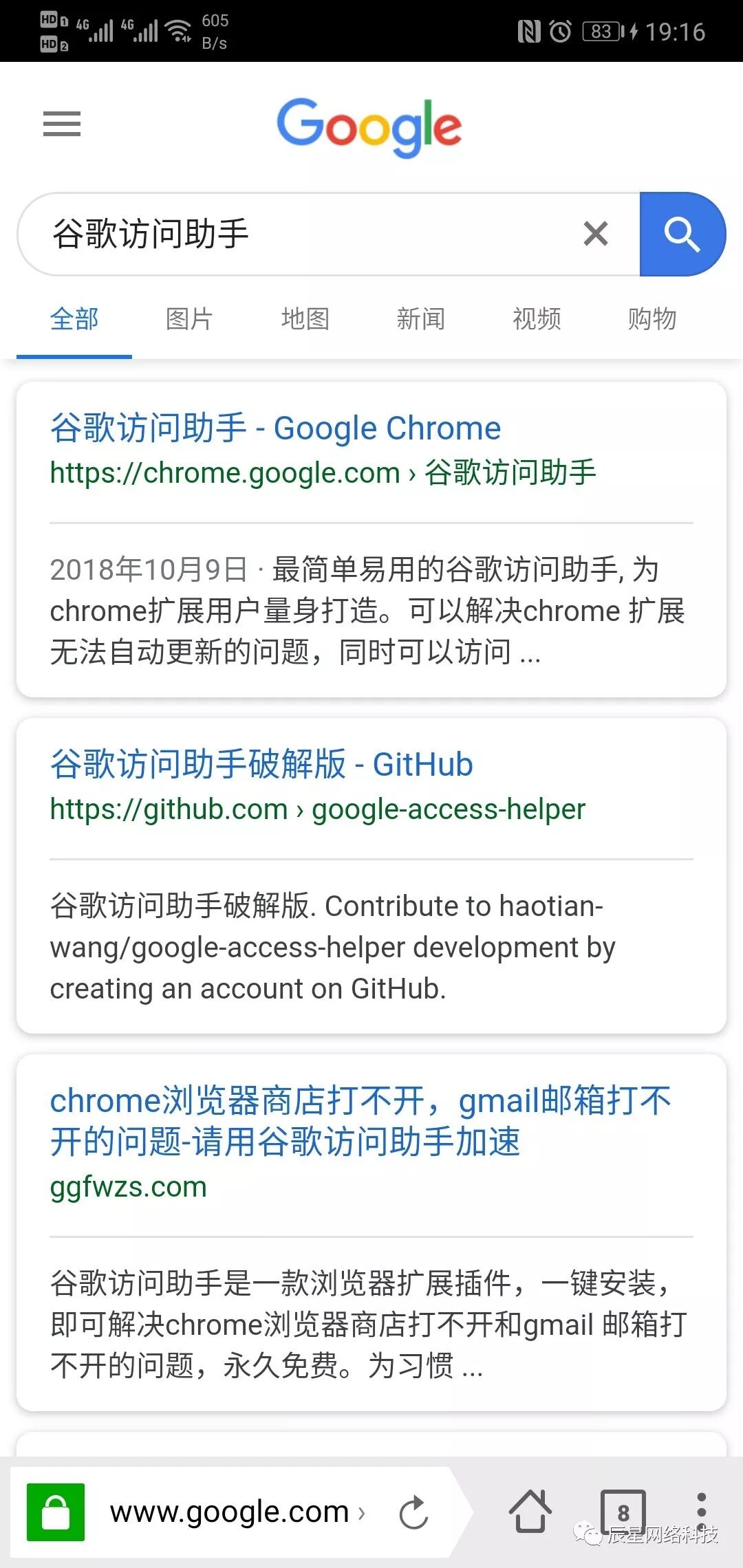我们为大家准备了适配Yandex浏览器的谷歌访问助手,获取方式如下:点击扫描下方二维码关注我们微信公众号辰星网络科技回复关键字YD获取Yandex浏览器下载链接;回复关键字助手获取适配Yandex浏览器的谷歌访问助手下载链接(注意暗号要搞错哦)。里面还有很多优质资源,如:各个终端电视直播软件、免会员观看各大视频网站视频、追书软件、游戏等,欢迎大家点击下方阅读原文查看更多。