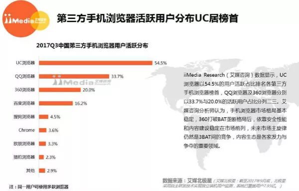 目前格局下,UC浏览器、QQ浏览器和360浏览器名列前三,然后是百度浏览器、搜狗浏览器、Chrome、欧朋浏览器、猎豹浏览器和其他。