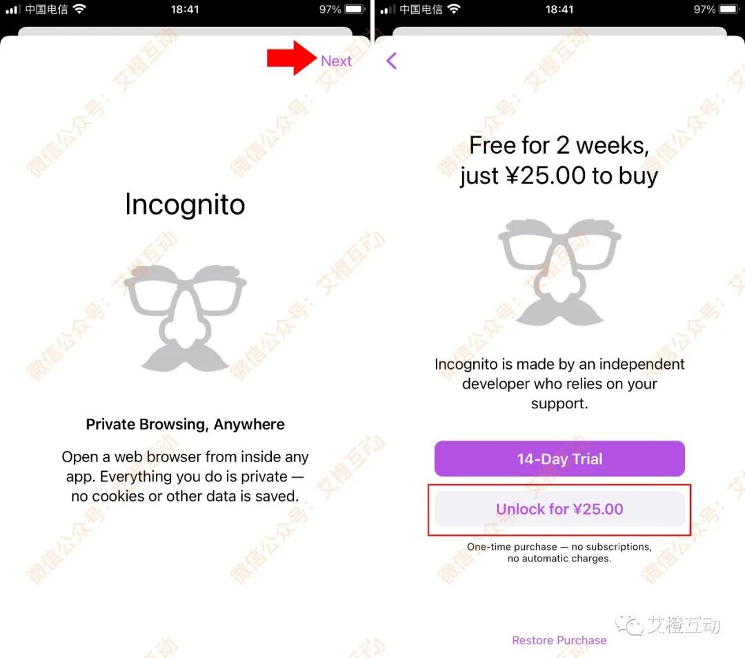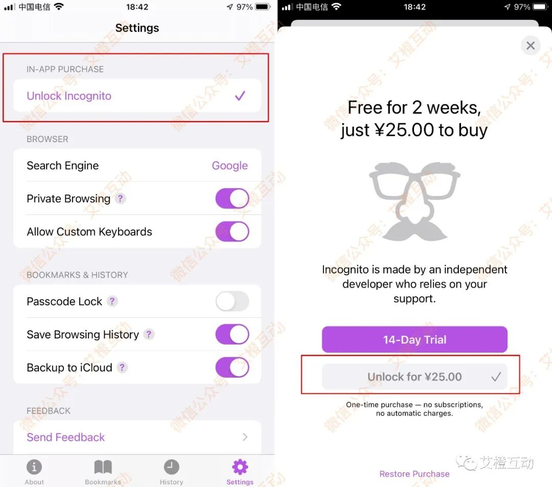 就可以看到内购页面,点击 Unlock for ¥25.00,进行购买,如下图右。
