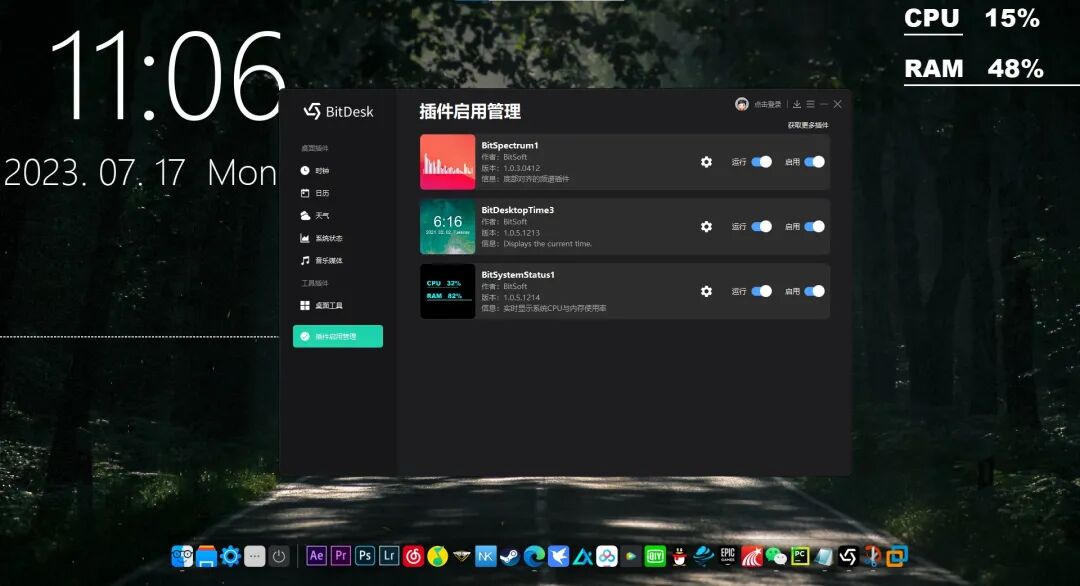 当电脑下载软件数量加大时,桌面的整理就成了一个问题,而比特工具栏则可以对桌面进行优化,并可以根据自己的喜好来进行美化,能添加独特的任务栏,如同 mac 任务栏一般。而他除了能够添加一个新的任务栏以外,还可以添加许多的插件如时钟,音乐频谱,系统状态等。