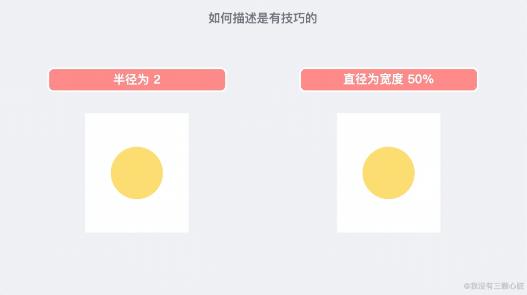 另外需要说明的是如何进行描述是有相当的技巧的。例如「正中心有一个半径为 2的圆」和「正中心有一个直径为页面宽度 50%的圆」是完全不同的: