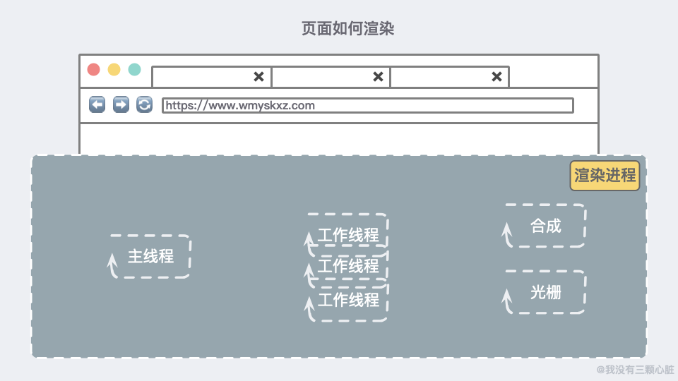 渲染进程内部包含主线程、工作线程、合成线程和光栅线程。