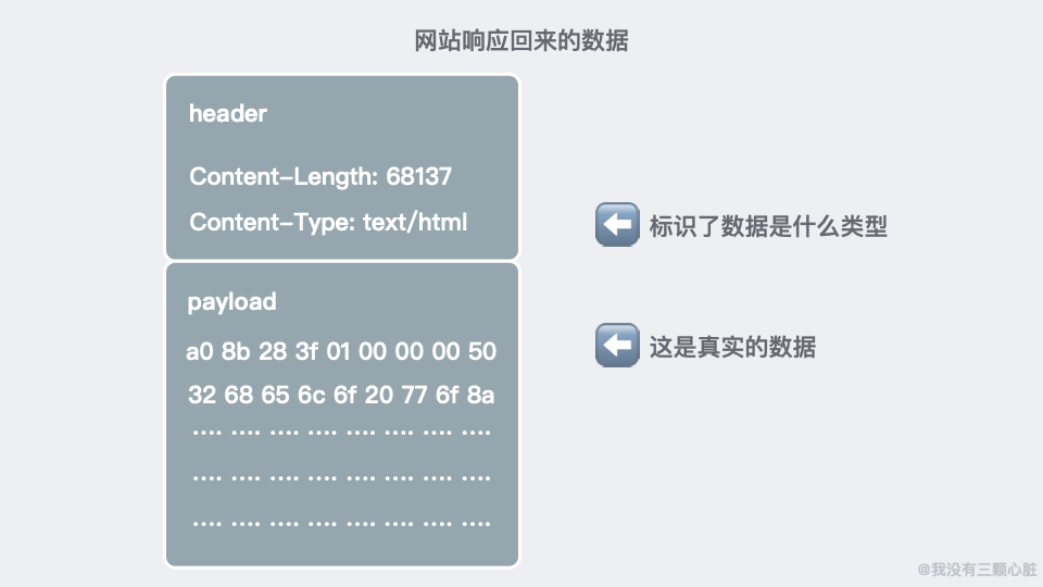响应分为 header 和 payload 两个部分。header 类似于一本书的版权、作者介绍等相关信息,而 payload 才是真实的数据内容。