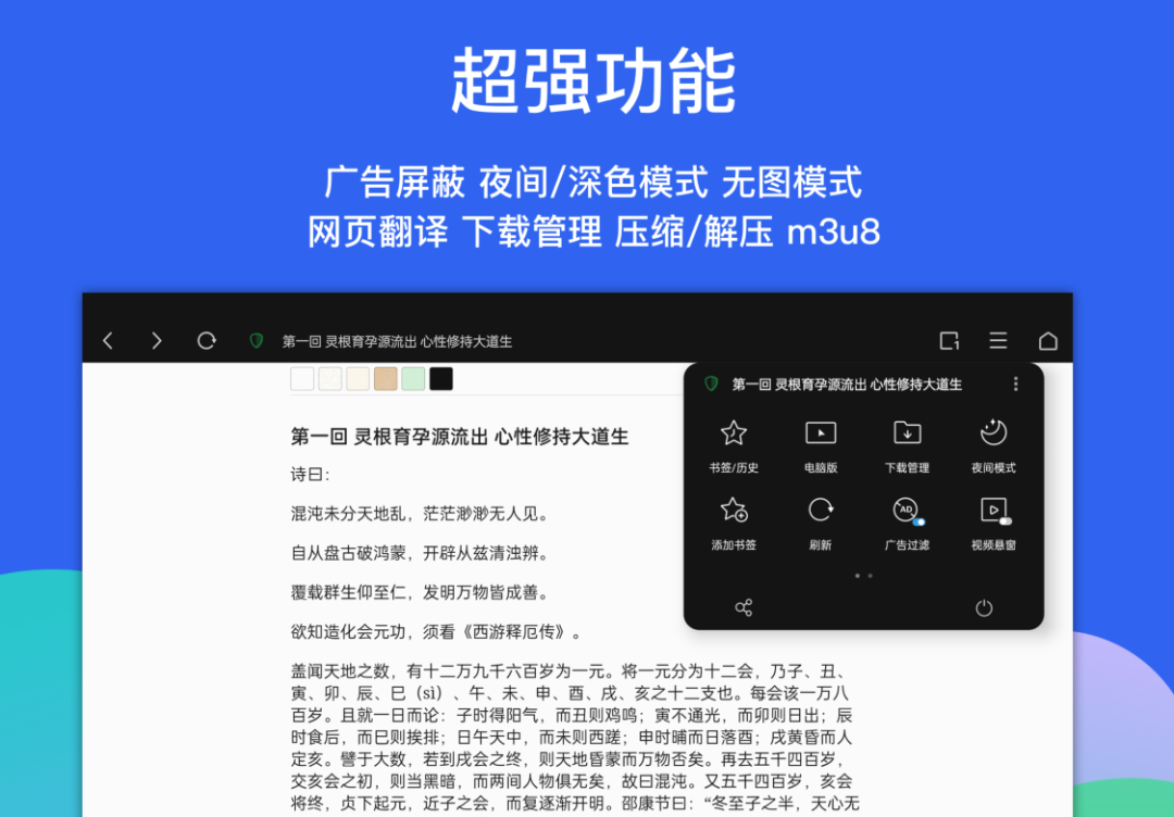 - 看图模式,批量保存图片- 内置Adblock Plus,可选多语言规则和第三方规则,自动屏蔽侵入式广告- 夜间模式和深色模式- 完美适配Pad和TV