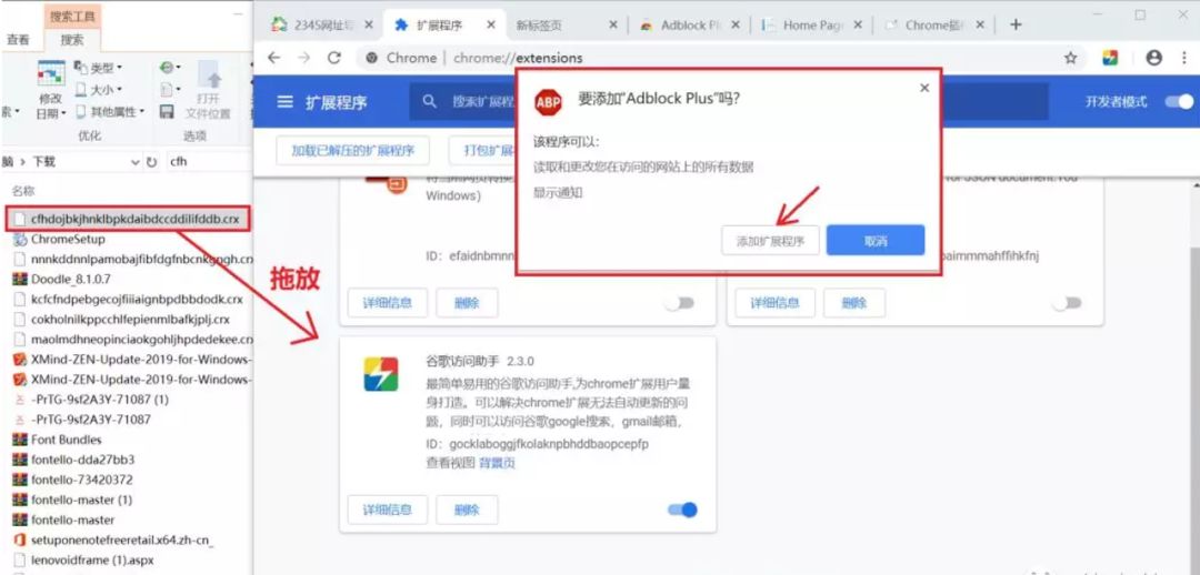 这个方法就是把下载的.CRX格式的文件直接拖放到扩展程序管理页面(chrome://extensions)。