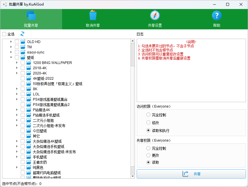 勾选需要设置共享的文件夹,并设置相应的共享和安全权限,一键完成批量设置。