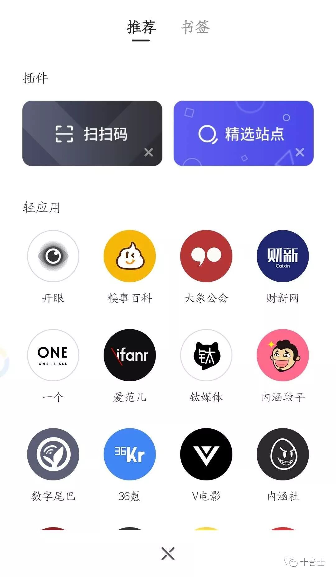 在浏览器主界面中向上滑动进入推荐页面。推荐里有插件、各种轻应用,如:开眼、糗事百科、大象工会等等几十种轻应用。方便快捷,可以少安装安装不少的软件了。