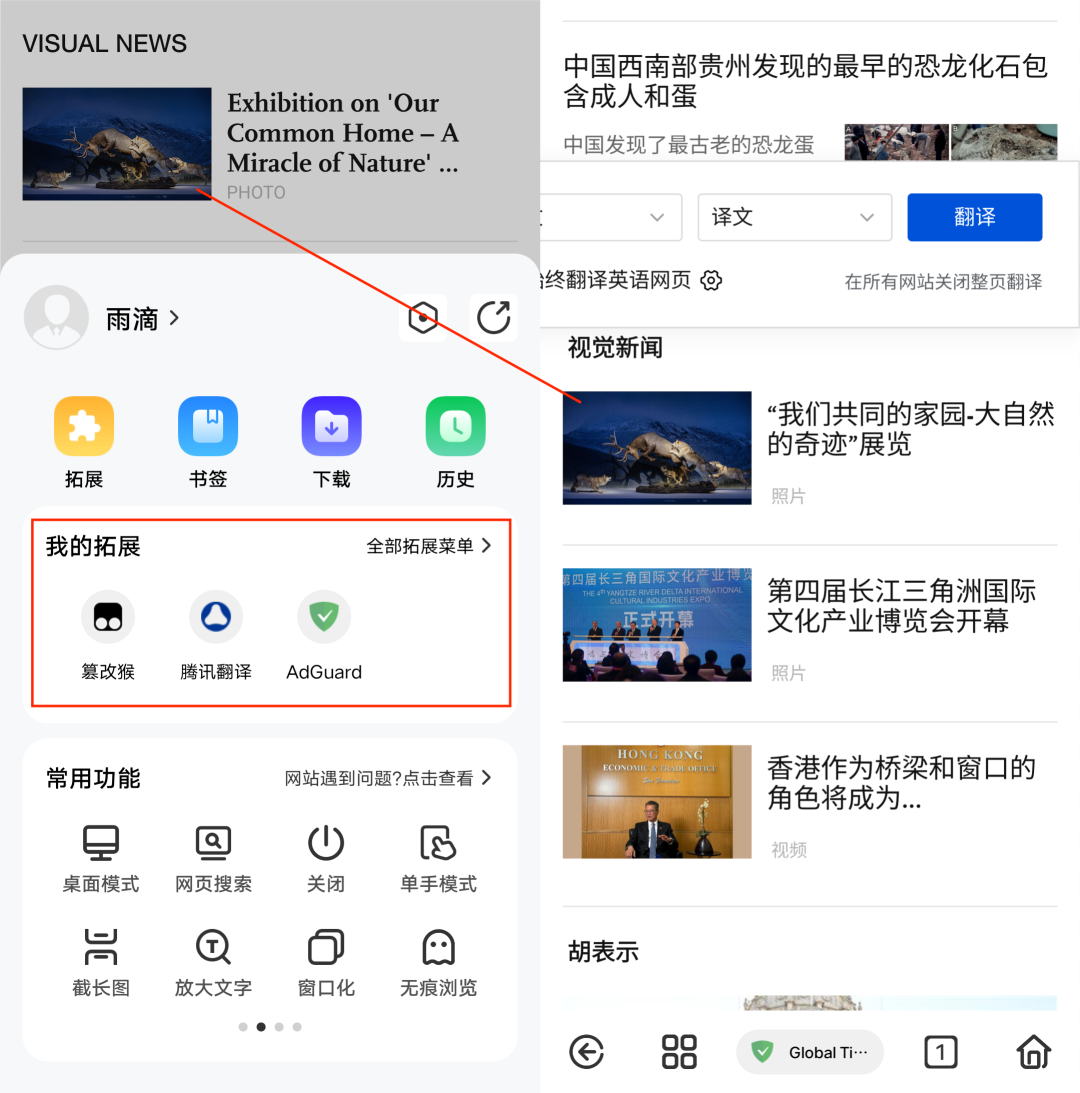 扩展功能更是作为浏览器一个独立的版块,存在于底部菜单栏里,据官方介绍,目前已收录了2W+的谷歌/火狐拓展,拥有极大可玩性。