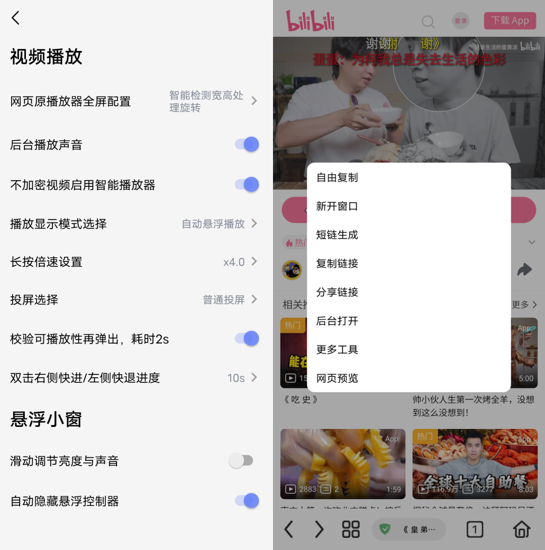 浏览器还提供了智能播放器,当网页视频是不加密的,将会自动弹出网页播放器,长按页面还可以进行自由复制、短链生成、IP备案查询、清除cookie等操作。