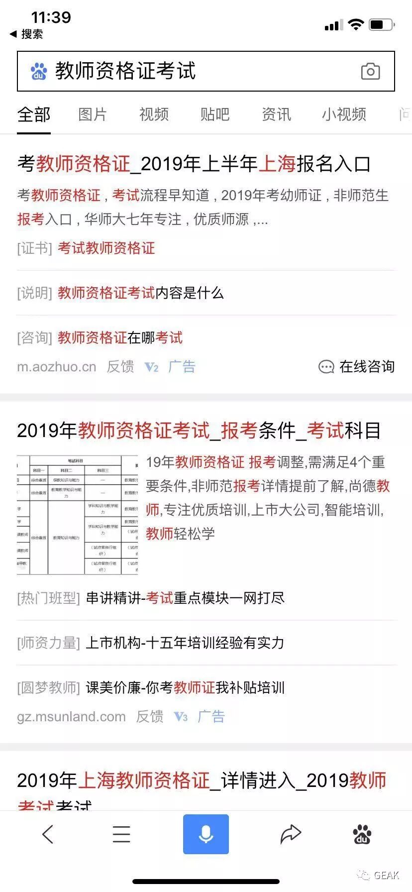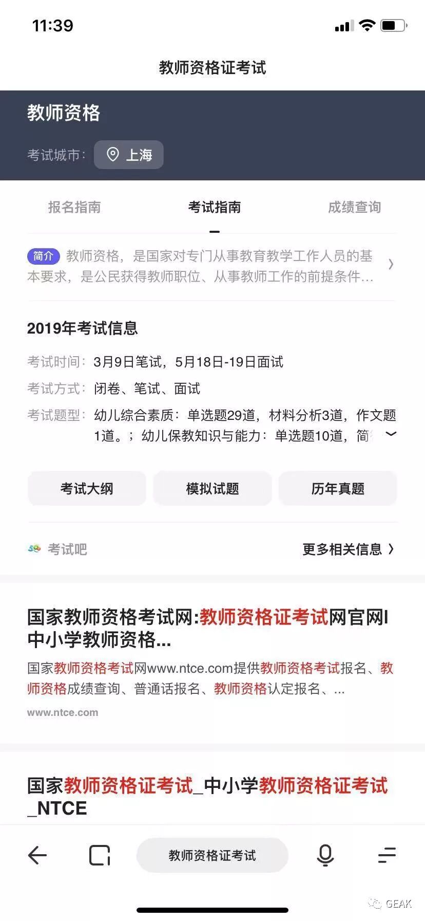这个我用事实说话,例如,我同事在百度和夸克搜索教师资格证考试的结果对比,百度首页显示的是广告,点进去没有任何有价值的东西,只有一个企业聊天咨询框,而夸克详细的在第一屏展示了2019年教资考试的精准信息,甚至包括,报名指南、考试指南、成绩查询。这才是我们想要的啊!