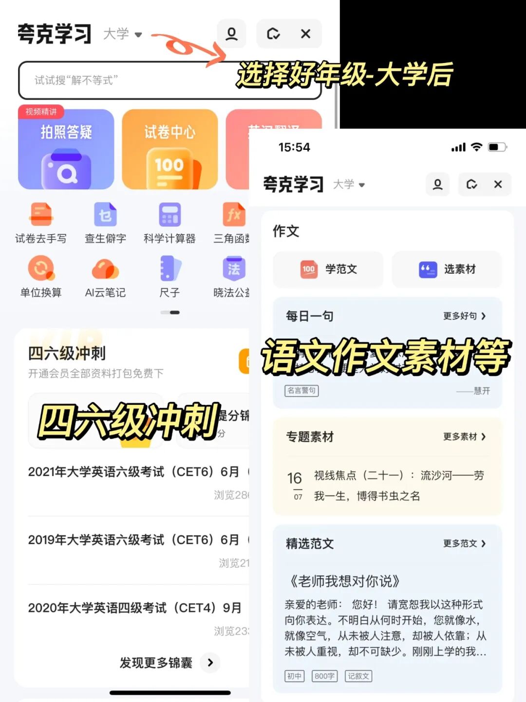 英语四六级题库、背单词、英汉翻译、英语/语文作文批改、语文作文素材、作文搜索、名著评析