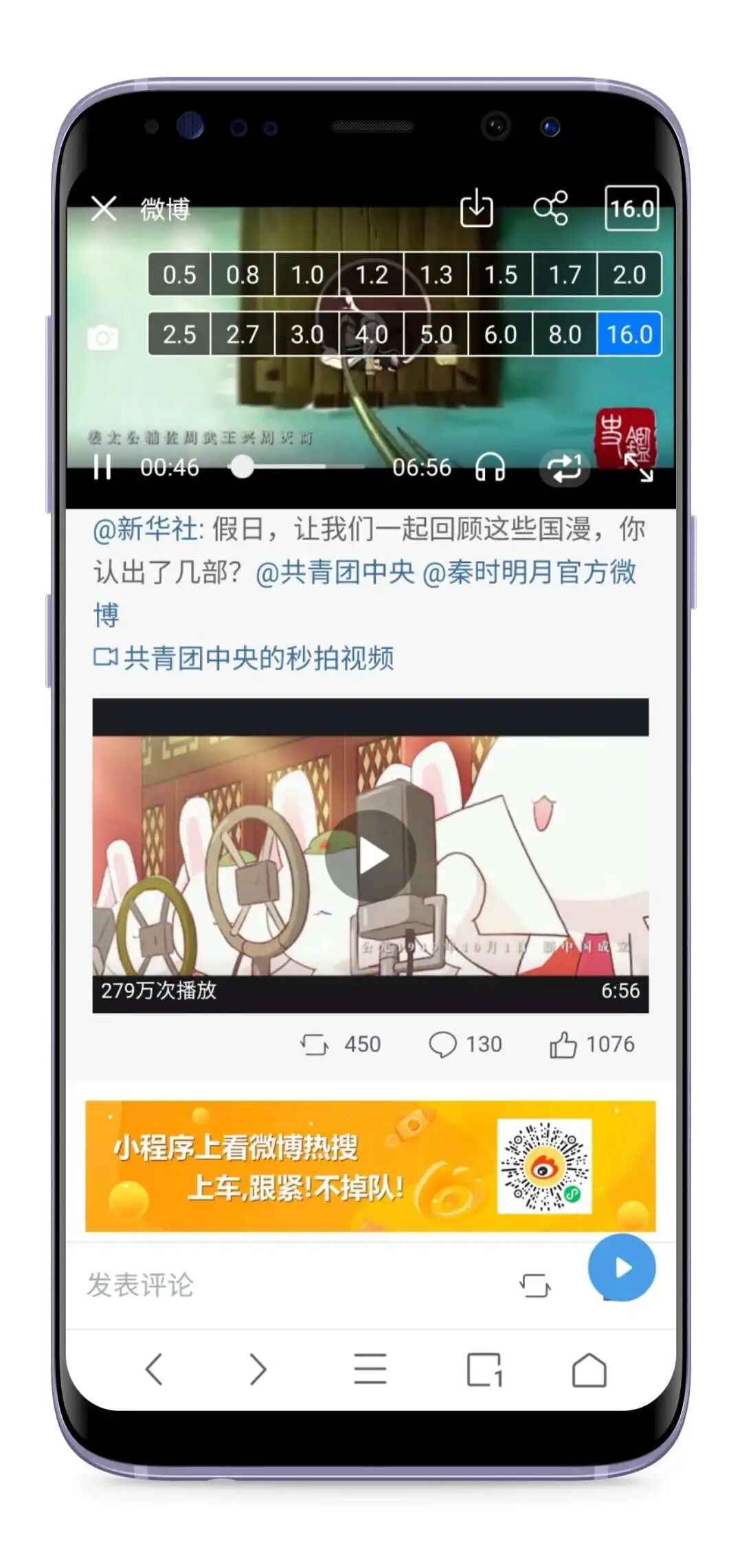 可以看见浏览器最高支持16倍速播放,当然不仅视频内容可以倍速播放,就连开头的植入广告也可以加速播放!对于喜欢在网页上看视频的铁铁来说简直是太tm爽了!