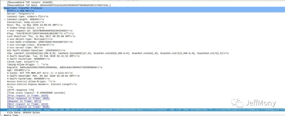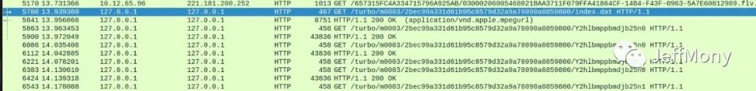 可以很清晰的看到很多127.0.0.1的请求,这就是在手机上搭建了一个本地代理,然后通过本地代理去服务器请求数据,播放器再从本地代理服务器上取数据。