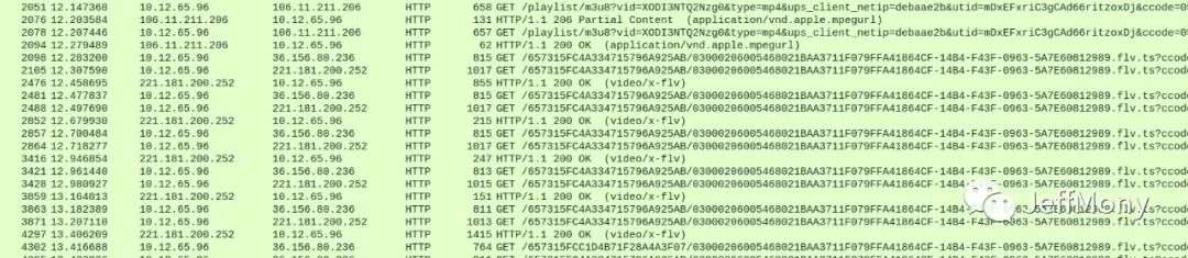10.12.65.96是本机的IP,发现server端的IP不断在变化,这次这是P2P的技术将client作为资源分发的工具,所以才能发现请求同域名的资源,请求的server端的IP不断在变化。仔细分析一下这些IP,发现这些IP都是在我附近的IP。如果是直接从视频源服务器上拉取数据,那server端的IP应该是固定的。