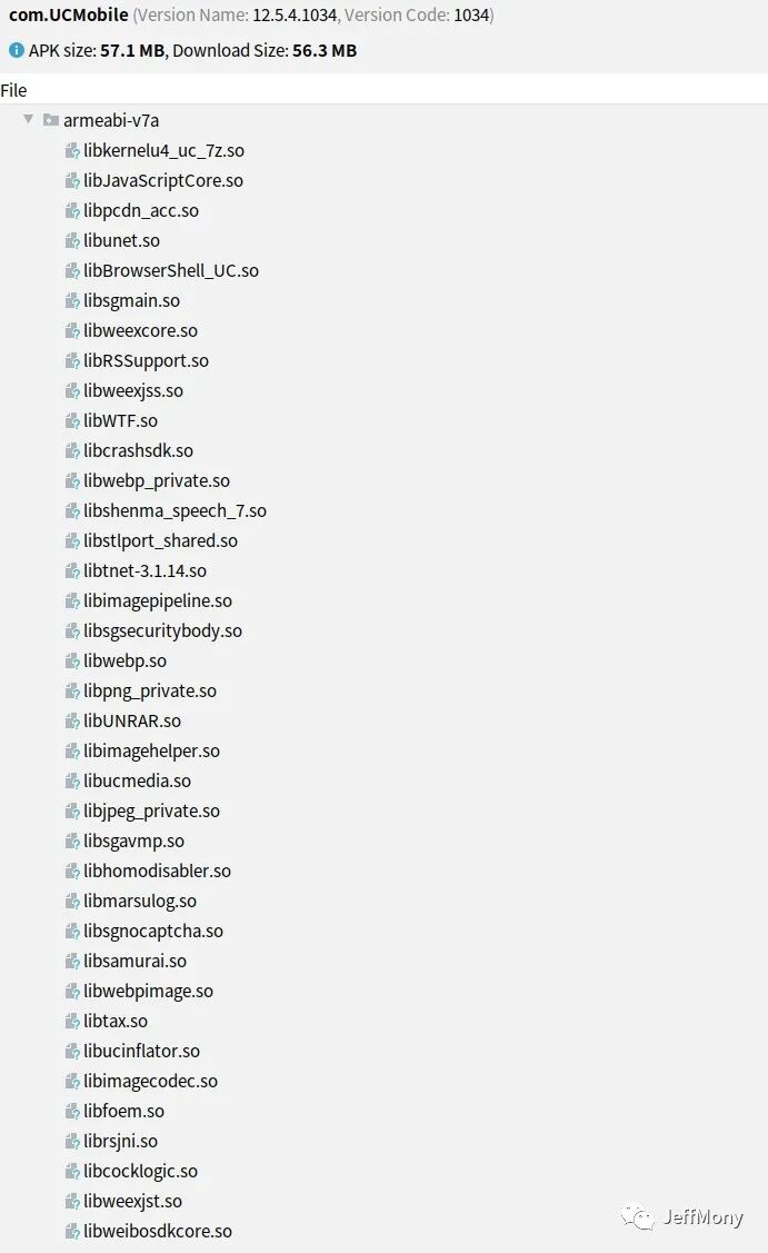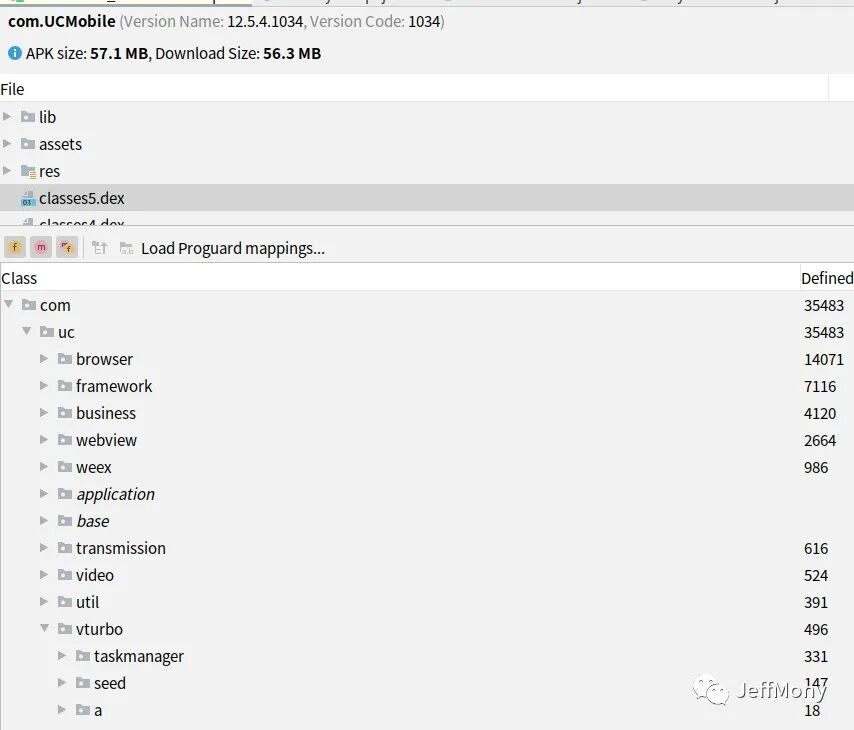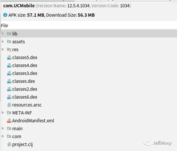 我们简单分析一下UC浏览器的apk包,反解一下apk文件,然后分析其中用到了什么技术。UC浏览器的版本是UCBrowser_V12.5.4.1034.apk,使用AndroidStudio分析一下apk包的总结构。