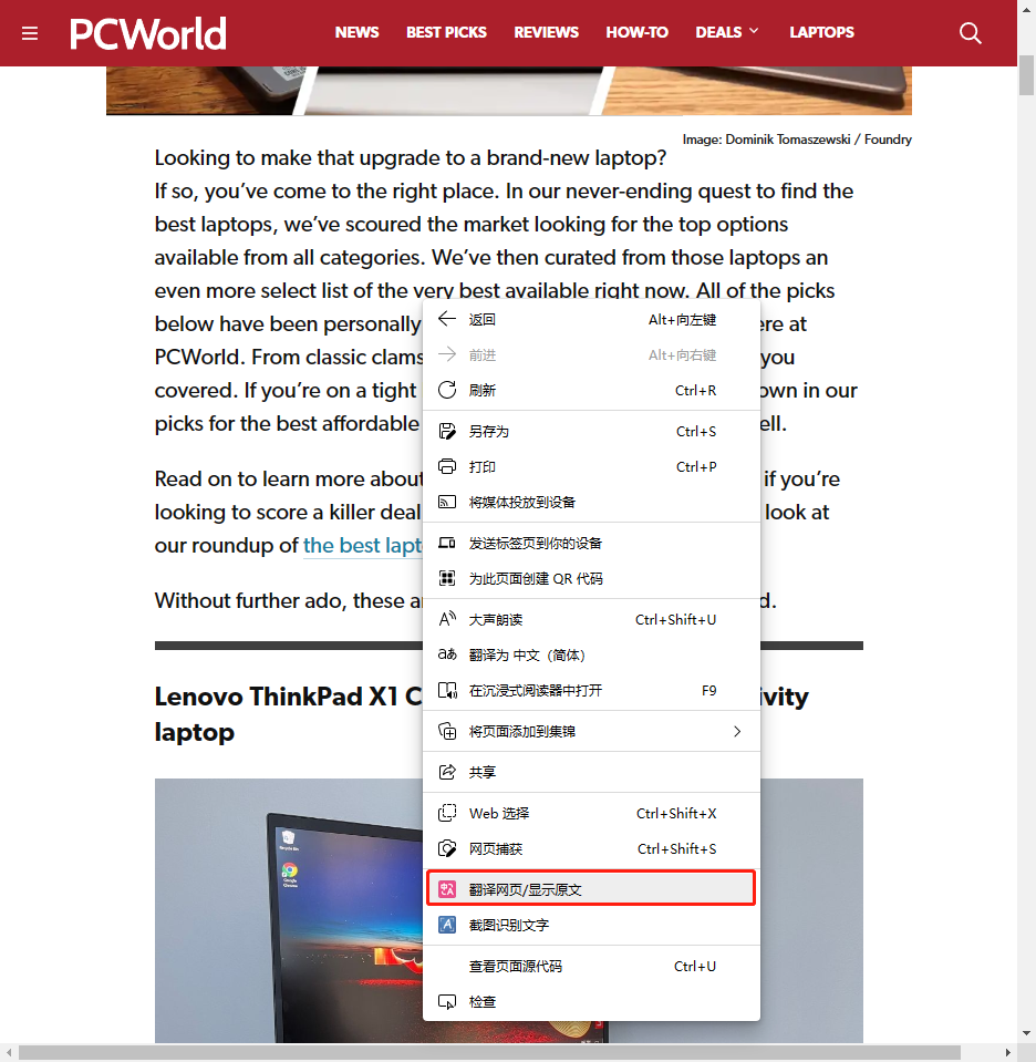 翻译操作也很简单,进入你要翻译的网站之后,打开右键菜单,会看到【翻译网页 / 显示原文】的选项,请点击它: