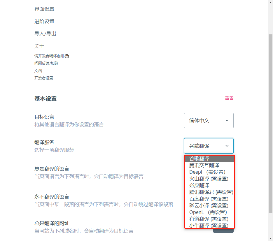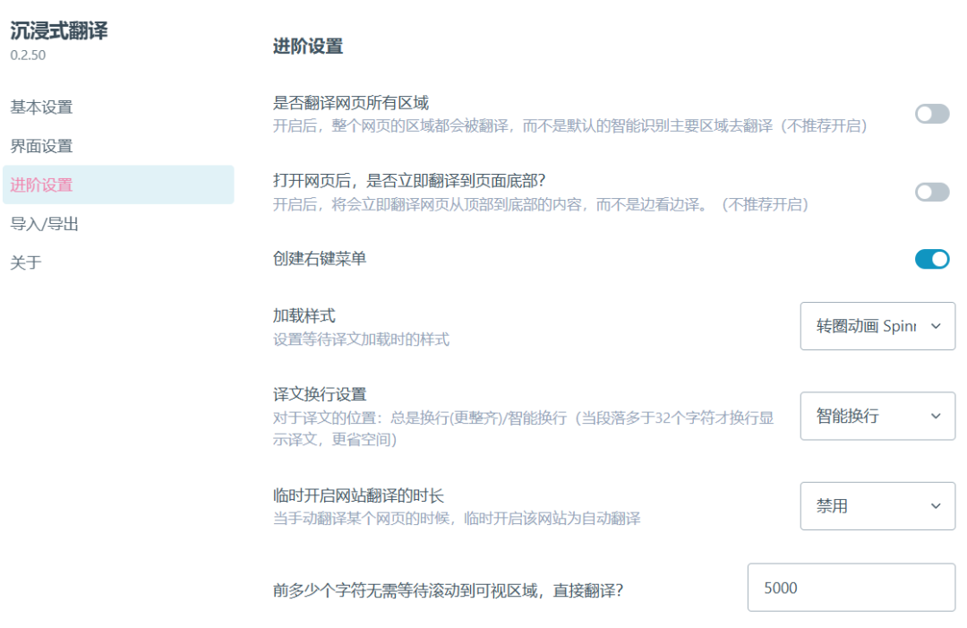进阶设置中,可决定是否要翻译网页所有区域、加载样式、译文换行设置等等: