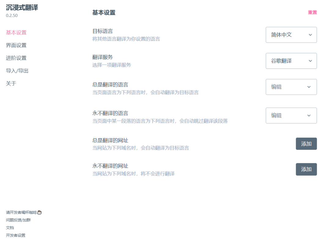 这款有提供蛮多设置调整的,翻译的目标语言默认为【简体中文】,翻译服务则是 【谷歌翻译】,如果你希望打开某些语言的网站直接启用自动翻译,可于【总是翻译的语言】中设置,也能添加【总是翻译的网址】与【永不翻译的网址】: