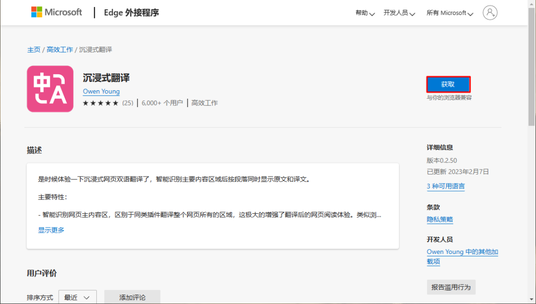 进到 Edge 插件商店后,点击右侧的【获取】: