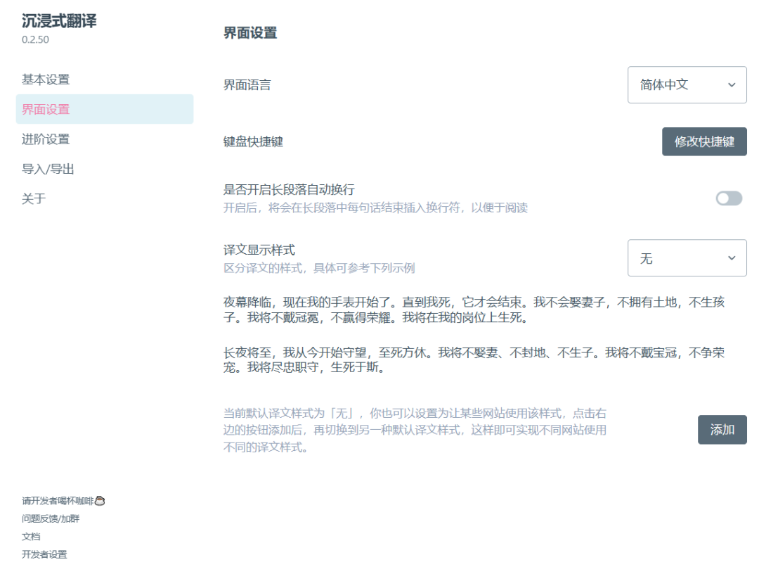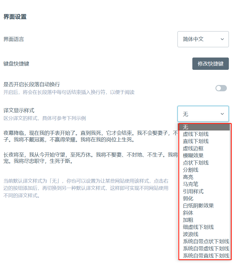 界面设置部分,可调整语言、键盘快捷键、译文显示样式等,比较值得注意的是译文显示样式,这边可能设置你希望的原文、译文显示样式: