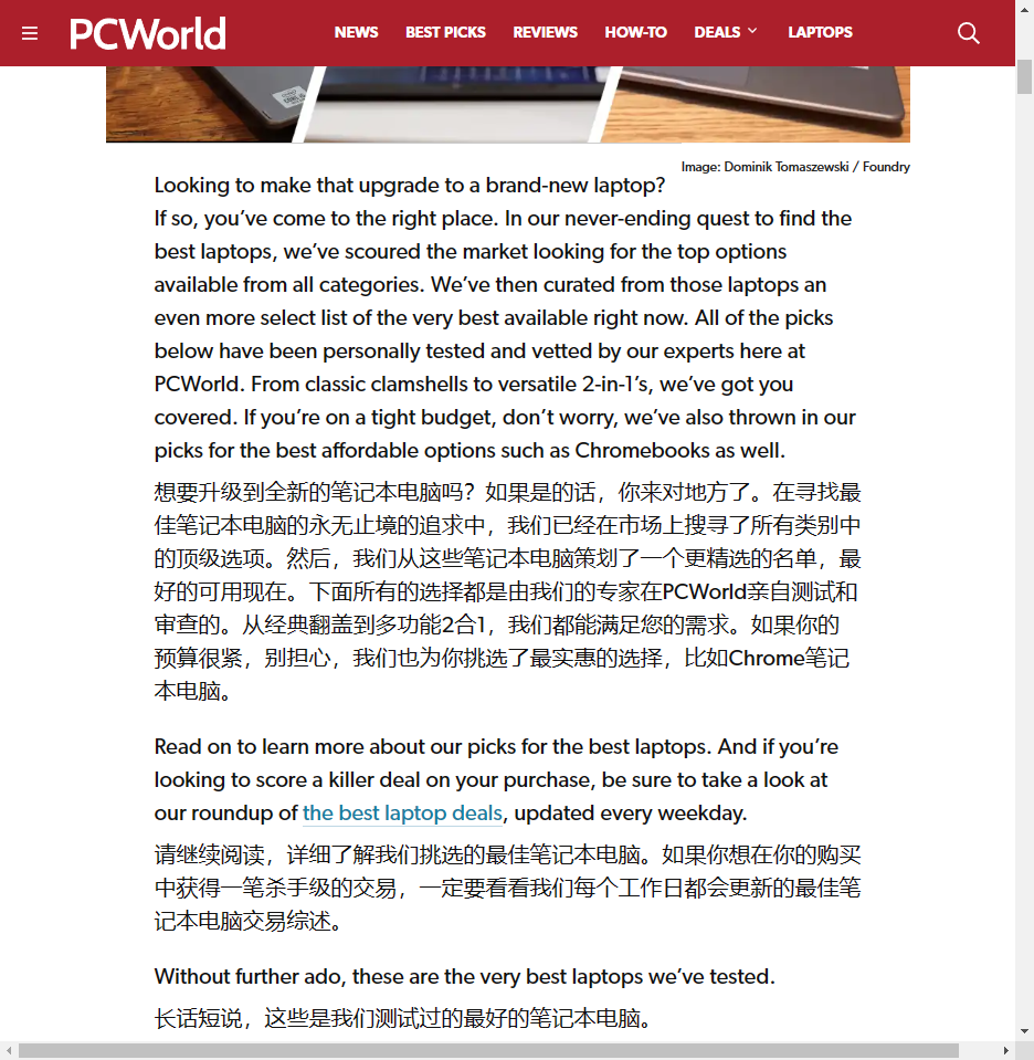 如果是使用浏览器的整页翻译,会将所有内容都变成中文,如果想要查询原文,就必须关掉整页翻译功能,又或是打开同一个新标签,查起来非常不方便: