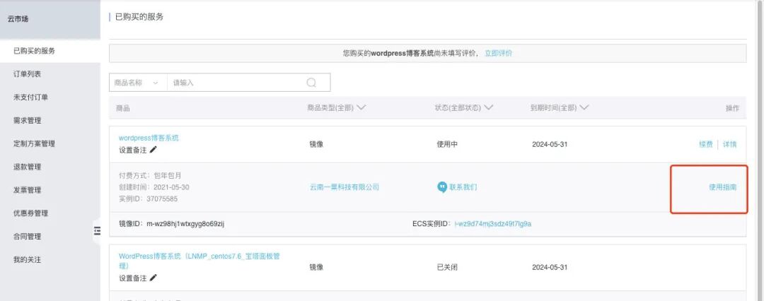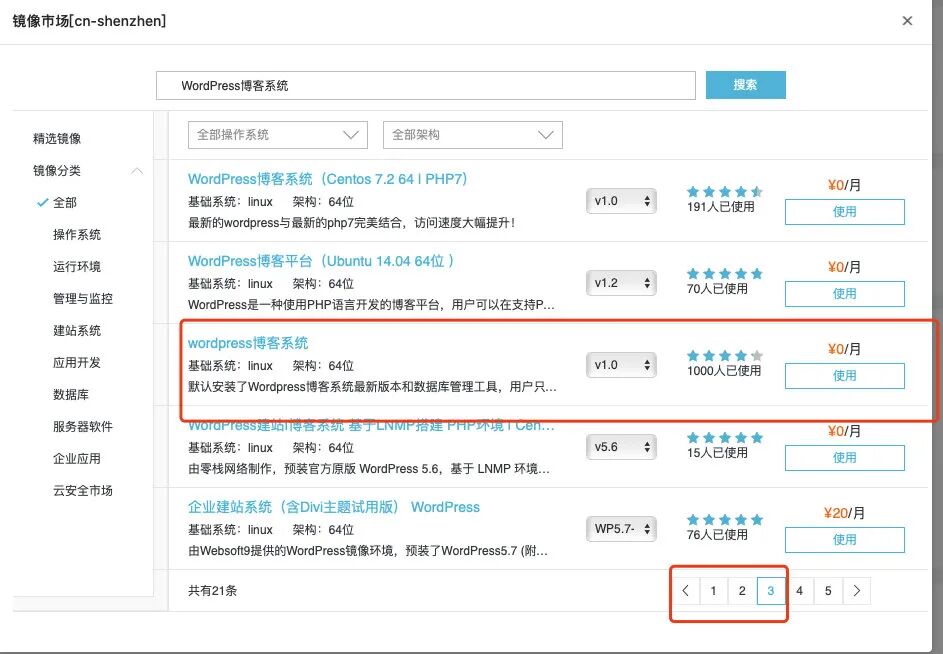 所以直接在镜像市场搜索「WordPress博客系统」,我用的是下面这个(镜像ID:m-wz98hj1wtxgyg8o69zij),大家可以多翻几页就能找到:
