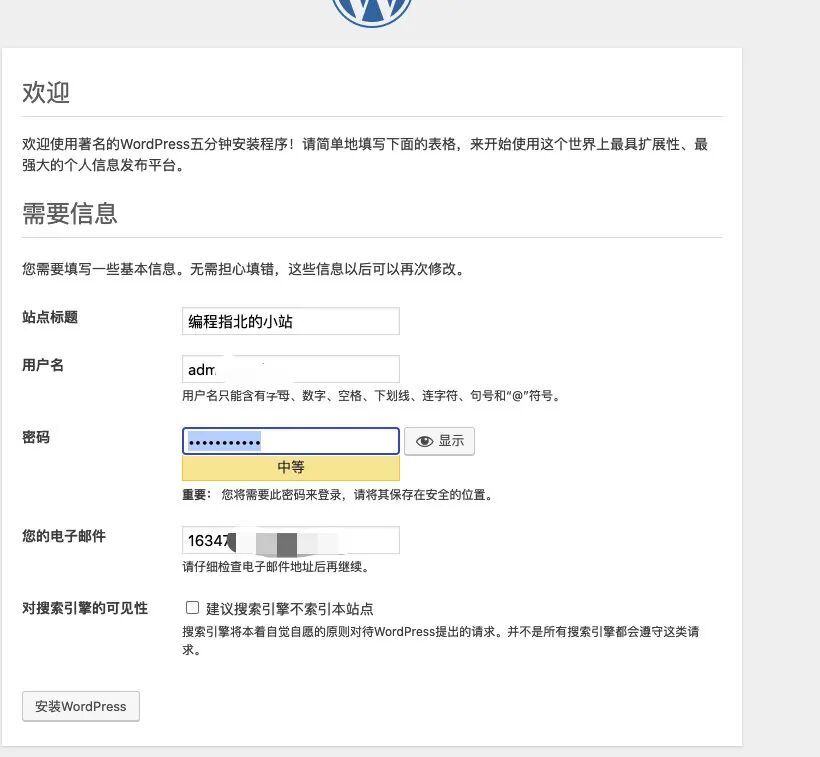 然后一路下一步,到设置一些站点信息,这些信息后面都是可以修改的,大家可以先随便设置下: