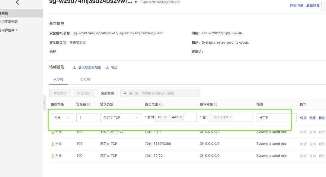 我们博客都是使用 HTTP 协议进行访问的,所以这里需要去安全组配置一下 80和443端口访问权限。