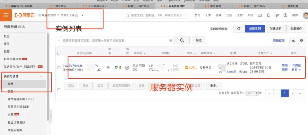 下单购买完成后,就可以进入控制台看到自己的服务器实例了:
