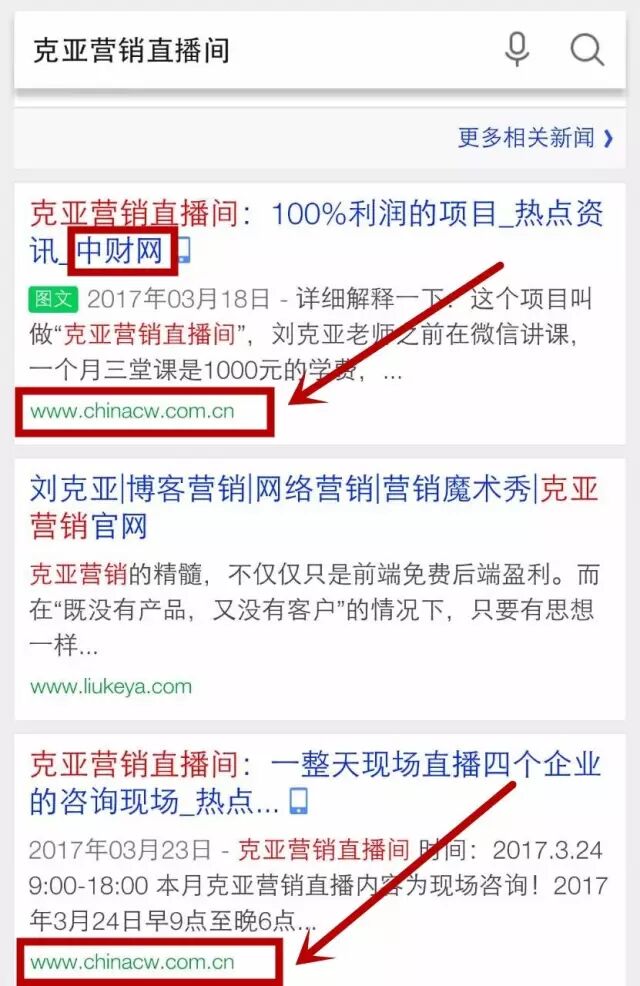 再搜索:克亚营销直播间,首页一共就10个位置,居然有两条被中财网占据!多的时候,有5条都是中财网的位置: