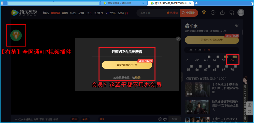 ●【有范】全网通VIP视频,在扩展中心搜"VIP视频"就能安装。比如清平乐第64集,没有会员貌似看不了,但是用了【有范】
