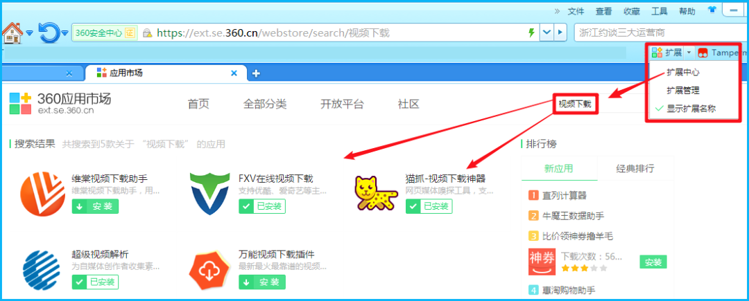 ●进入360主页,右上角有个扩展,点开扩展中心,在搜索框输入"视频下载",可以看到相关的插件。比如猫抓,一个视频下载利器,当你观看网页视频时,猫抓会自动抓取视频,如下图: