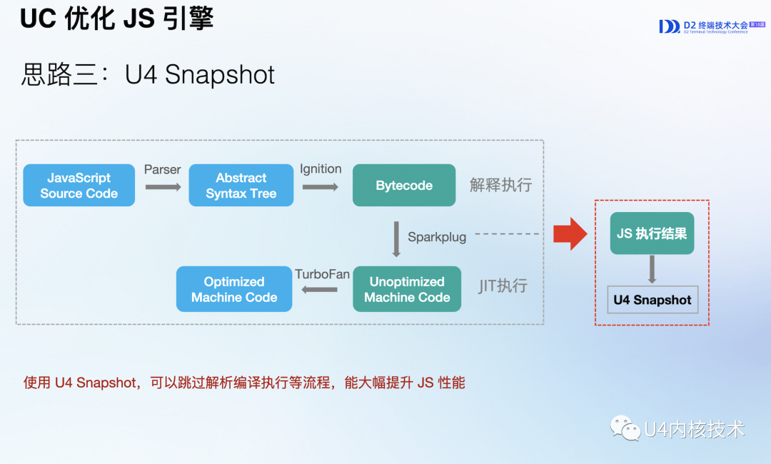 前面我们讨论的是 Code Cache 链路的优化,那么 JS 运行链路是否还能继续优化呢?基于这样的设想,我们在 U4 5.0 内核研究实现了 U4 Snapshot 技术。U4 Snapshot 技术,通过我们的 JS 离线编译器将 React 等框架 JS 的运行结果镜像化为 Snapshot 文件,页面在执行相应 JS 的时候就可以直接使用 Snapshot 中存储的信息,而不需要再走 JS 解析、编译、执行等流程,这样相对于 AOT 还能再进一步提升 JS 性能。生成 Snapshot 的过程是比较耗时的,所以我们一般会离线生成 Snapshot 文件再通过 Pars 离线包机制提前下发到客户端。V8 Snapshot 技术是 U4 5.0 内核支持的最新 JS 引擎技术,我们已经应用到夸克上的部分业务,有比较好的效果。