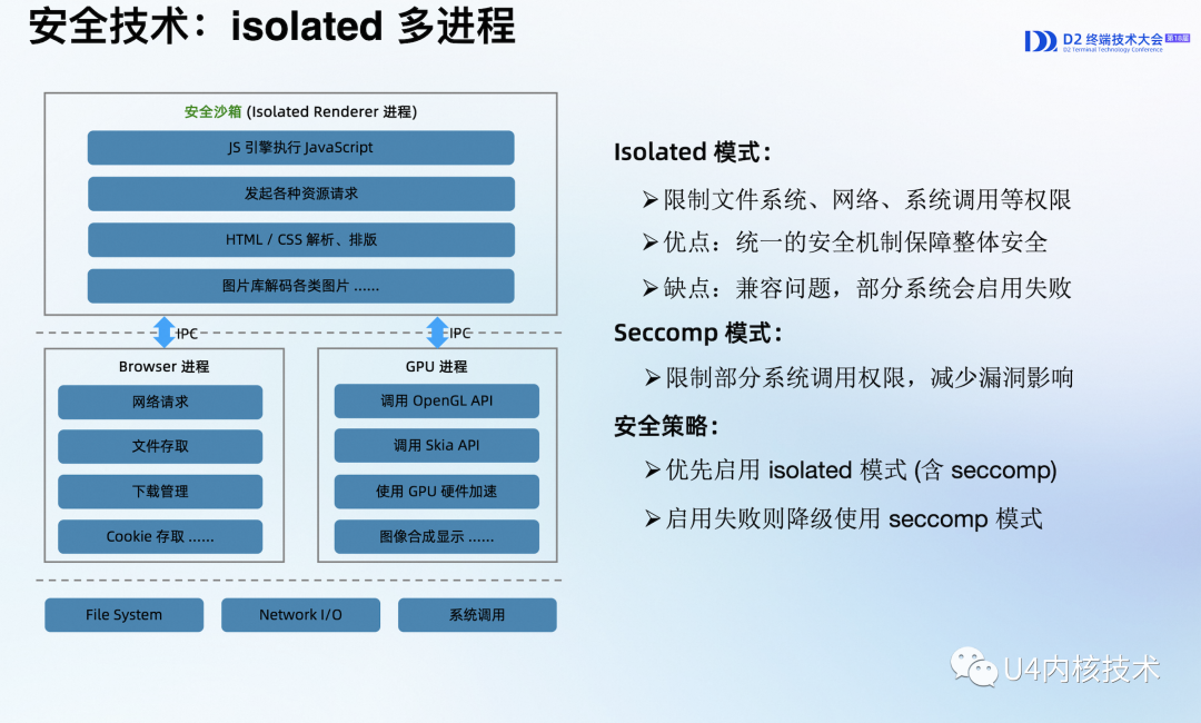 Isolated 沙箱进程就是一个非常有效的安全技术。前面提到页面很容易通过 JS 执行攻击。比较好的想法就是把执行 JS 的 Renderer 进程限制在一个安全沙箱里,这个沙箱里文件系统、网络、系统调用等权限都会受到限制,这样就能让风险最高的模块处于一个相对安全的环境,从而能达到较好的安全效果。但是,Isolated 模式也有缺点,兼容性不是很好,部分系统会启用失败。所以我们会让 Renderer 进程优先启用 Isolated 模式,启用失败就降级到 Seccomp 模式。其中 Seccomp 模式是通过限制部分系统调用来保障一定程度的安全性。