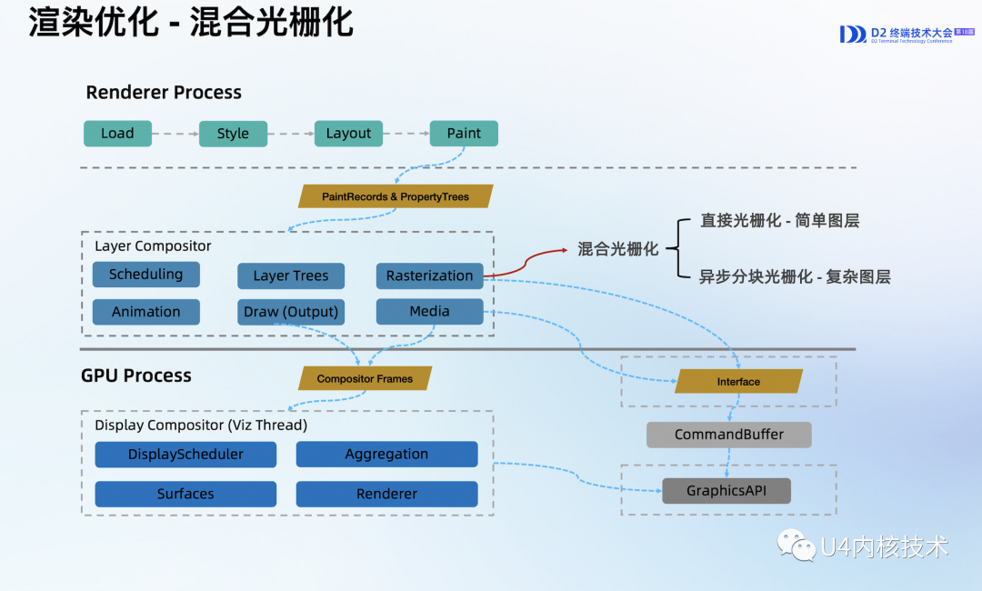 现在手机设备性能很好,大部分场景使用直接光栅化也能在一帧内很好地完成渲染流程,在这些场景里,直接光栅化既节省了内存,又提升了渲染效率。但是,部分页面的图层非常复杂,直接光栅化不能在短时间内完成,这样就可能会出现卡顿掉帧,这些场景里异步分块光栅化是更好的选择。在 U4 5.0 内核我们会根据图层复杂度动态选择光栅化策略,简单图层使用直接光栅化,复杂图层使用异步分块光栅化,在同一个页面,也可以部分图层使用直接光栅化,部分图层使用异步分块光栅化,我们把这种叫做混合光栅化,这在实践中有更好的效果。