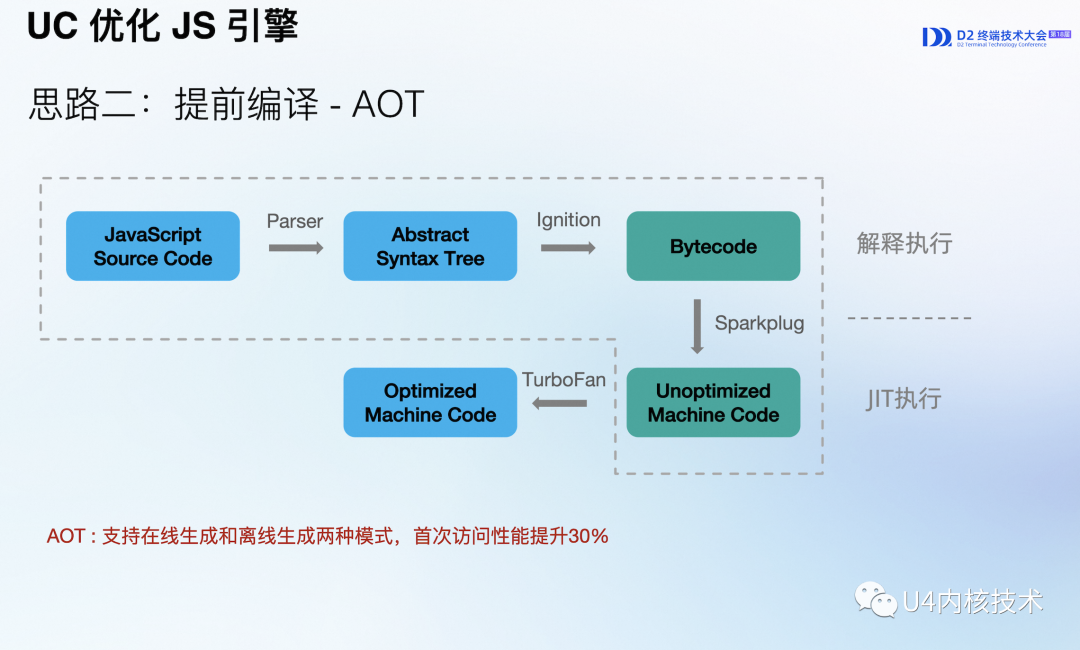 在前面我们已经把 Code Cache 性能优化得很好了。但是 Code Cache 有个特点,它需要在访问页面时生成,至少要在第二次访问时才能生效,原生的生效时间甚至要更晚,在 72 小时内访问两次才会生成,第三次访问才能使用。但是很多页面的首次访问性能也是非常重要的,比如活动页、推送页、唤端页等等,那么有没有办法让第一次访问也能用上 Code Cache 呢?这就是我们的第二个优化思路 AOT,提前编译生成 Code Cache。我们的 JS AOT 技术支持在线生成和离线生成两种模式,在线模式是客户端 Worker 线程在空闲的时候生成,离线模式是在服务端生成下发到客户端,在生成 AOT 文件之后,用户首次访问页面时就能用上 Code Cache,页面首次访问性能能提升 30% 以上,效果很好。