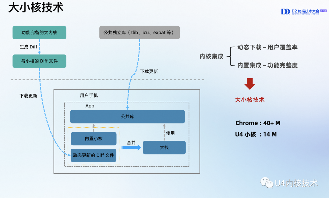 下面介绍大小核技术。我们先聊聊内核的集成方式,内核集成一般有两种方式,动态下载和内置集成,动态下载由于依赖网络下载,会存在用户覆盖率问题,下载成功前可能部分业务场景会存在不可用的问题,一些重要的端很难接受这种不可用的问题,所以一般会做内置集成。内置集成,一般需要集成一个相对较小的内核,需要多小呢?Chrome 原生 64 位内核大约是 45 M,我们优化后的 U4 64 位小核是 14 M,在嵌入式 WebView 场景下,基本上也能算是业界最小了。U4 小核能够满足阿里巴巴集团内绝大部分业务场景的能力诉求。在 Size 优化技术实现上,我们更多是依赖内核底层技术优化来做内核小型化,当然我们也裁剪了一部分 Web 特性能力,但主要是一些老旧废弃或较少使用的功能。而对于一些有特殊能力诉求的业务场景,需要用到更加完整的内核功能,又期望能覆盖全部用户,我们也提供了大小核技术来满足此类场景的能力诉求。