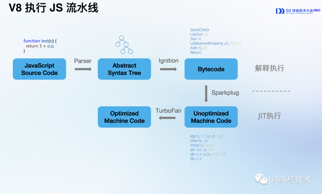 我们先看看 V8 执行 JS 的流水线。V8 在运行 JS 的时候,会先把 JS 源码解析成抽象语法树,接着会将抽象语法树编译为字节码,字节码解释执行。在满足一定条件的时候可以继续编译生成未优化版本或优化版本的机器码,机器码直接执行。