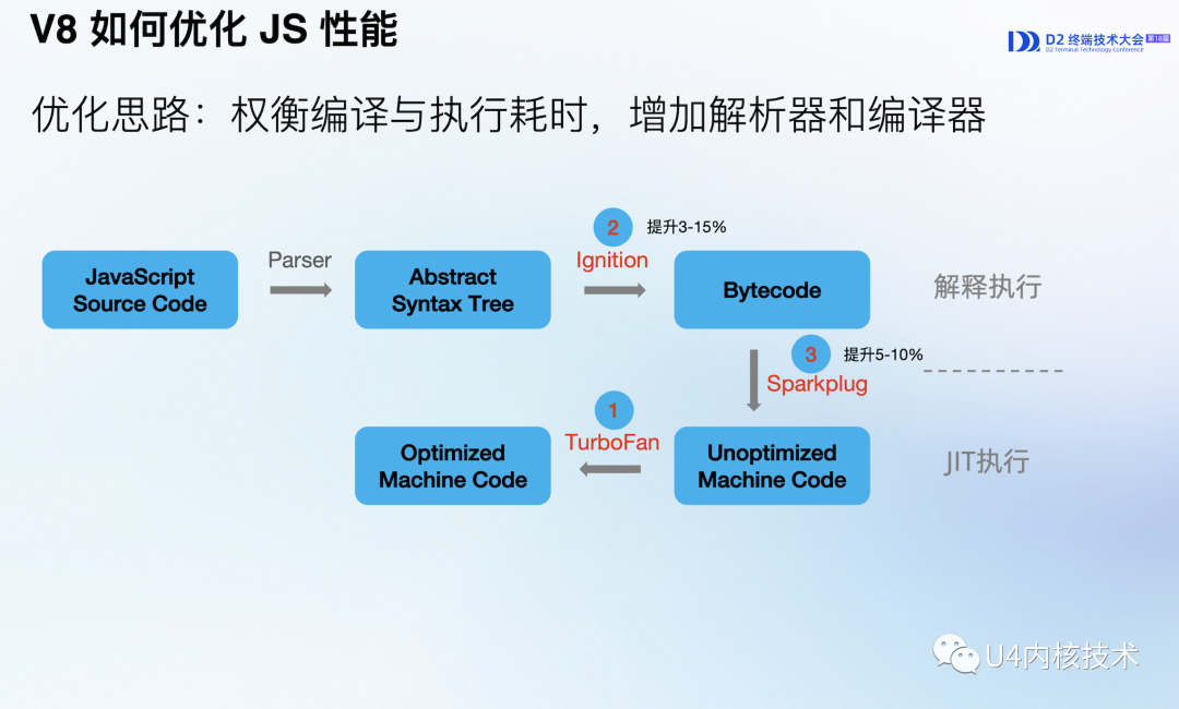 Chromium V8 团队是怎么优化 JS 引擎的呢?V8 逐步引入了 Crankshaft 优化编译器、TurboFan 优化编译器、Ignition 解析器和 Sparkplug 非优化编译器,而且还在持续演进中。那么 V8 为什么要引入这么多的解析器和编译器呢?它其实是在权衡编译耗时和执行耗时,期望找到一个最优解。JS 一般有解析、编译和执行等流程,这些流程的总耗时最小才是最优的。优化机器码的执行效率比较高,但编译时间比较长,总耗时并不小。字节码和非优化机器码,它们编译效率比较高,虽然执行效率稍差一些,但是总耗时反而是更小的。V8 会优先把 JS 快速编译成字节码或者非优化机器码,在满足一定条件时再编译成执行效率更高的优化机器码,这样就能很好地平衡解析耗时和执行耗时,从而能达到更好的性能效果。