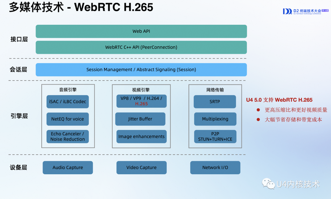 多媒体技术,我们再看一下当前非常热门的 WebRTC 技术。WebRTC 提供了一套标准 API,使Web应用在不需要借助任何插件的情况下可以直接提供实时音视频通信功能。U4 5.0 内核支持了 WebRTC H.265 技术,原生 Chromium 内核还不支持该技术。支持 WebRTC H.265,在技术流程上与 H.264 是比较相似的,都需要处理编解码和 RTCP 流等流程。我们为什么要支持 H.265 技术呢?业务在使用 WebRTC 的过程中,反馈服务器成本压力比较大,所以我们研究支持了 H.265 技术。与 H.264 相比,H.265 有更高的压缩比和更好的视频质量,能大幅节省服务器存储成本和带宽成本,大概能节省 30-50%,有非常大的业务价值。