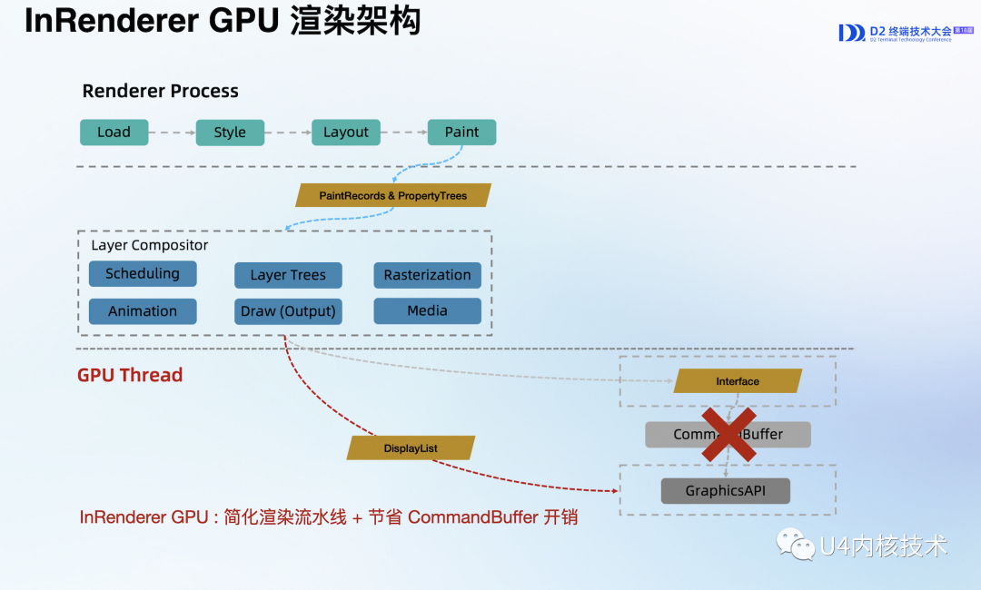 在 InRenderer GPU 渲染架构里,我们把 GPU 进程变成 Renderer 进程的一个子线程,合成器产生的 DisplayList 可以直接交给图形库处理,整个过程不需要产生 CommandBuffer,从而减少了中间 Buffer 带来的开销。这样,我们就更进一步优化了渲染流水线,既节省了内存,又提升了整体的渲染性能。